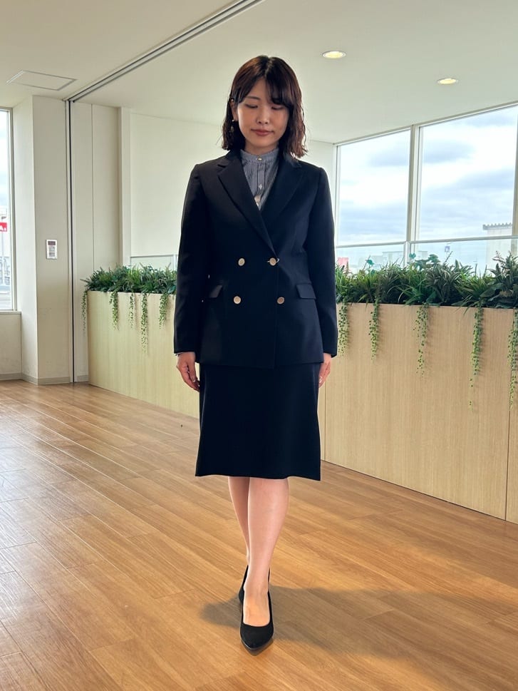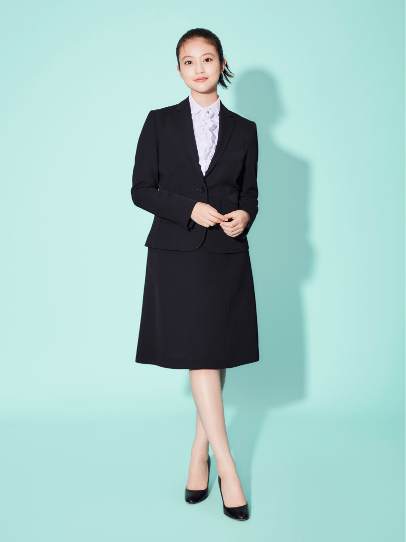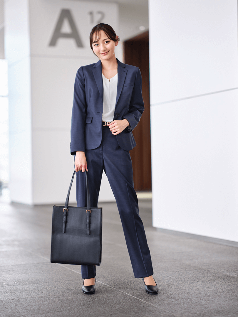 若々しくて、清潔感あふれるネイビーは好印象間違いなしのカラー。控えめなシャドーストライプは、さりげないお洒落を楽しませてくれます。ここに女性らしさをプラスするのはインナーの役目。取り外しできるフリル付きのシャツなら、華やかさと可愛らしさが同時に叶います。