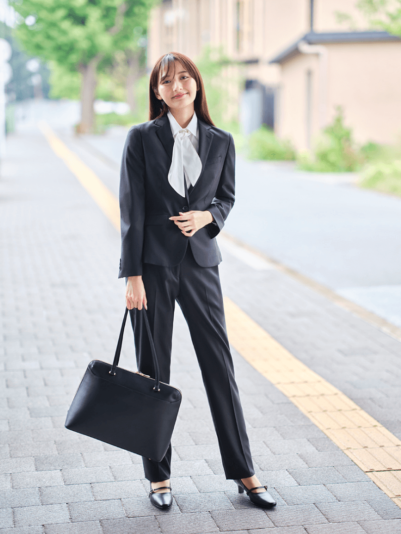 黒無地セットアップに白のリボンシャツを合わせた清潔感のある可愛いスタイル。セットアップはストレッチ素材のため動きやすく、洗濯機で洗えるためお手入れも簡単。後の就職活動にも使えて便利です。