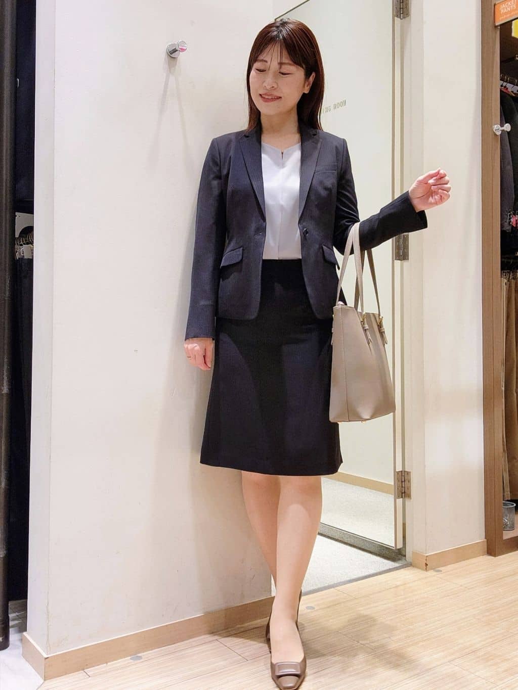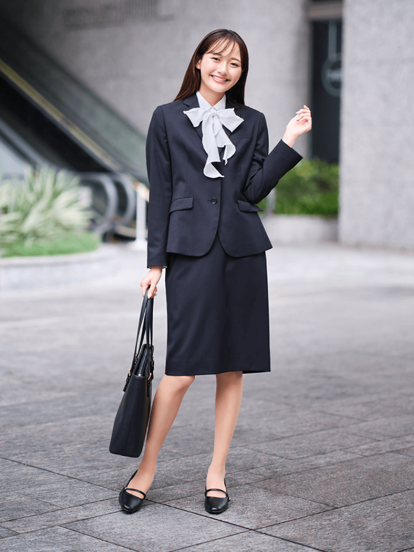 ネイビーのシャドーストライプスーツはビジネスシーンで好印象間違いなし。白のボウタイブラウスで清潔感と可愛らしさをプラスして。
